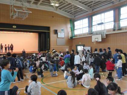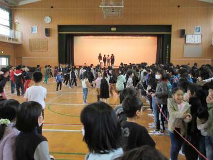 今日は児童集会です。子どもたちは、元気に講堂に集まり、集会委員の進行で〇✕クイズをしました。