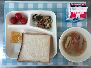 11日の給食は、ほたて貝のグラタン・だいこんのスープ・プチトマト・食パン・牛乳・マーマレードです。