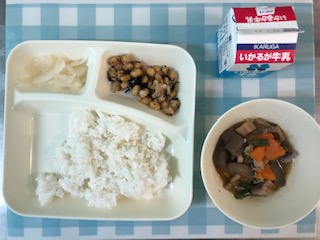 15日の給食は、筑前煮・ひじき豆・だいこんのゆず風味・ごはん・牛乳です。