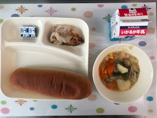 30日の給食は、あじのレモンマリネ・スープ煮・固形チーズ・黒糖パン・牛乳です。