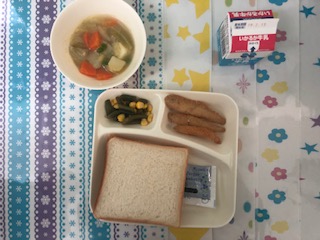 7日の給食は、わかさぎフライ・スープ煮・三度豆とコーンの甘酢和え・食パン・牛乳・ブルーベリージャムです。