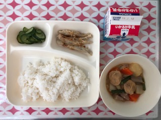 12日の給食は、きびなごてんぷら・ひとくちがんもと大根の煮もの・あっさりきゅうり・ごはん・牛乳です。