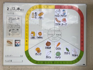 給食室前に新しく給食献立ボードが入りました。給食委員会が中心となって、これから毎日の給食の献立に使用される食品を黄・赤・緑に分けて掲示していきます。