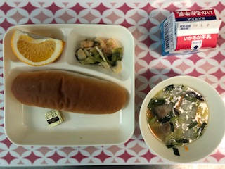 4日の給食は、えびとチンゲンサイの炒めもの・中華がゆ・はっさく・大型コッペパン・牛乳・バターキューブです。