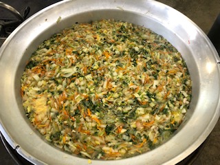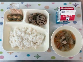 5日の給食は、豚肉とれんこんの炒めもの・すまし汁・きな粉よもぎだんご・ごはん・牛乳です。