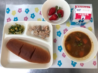 フライドチキン・カレーシチュー・春のカラフルソテー・いちご・黒糖パン・牛乳です。