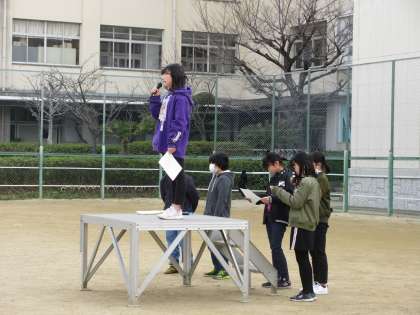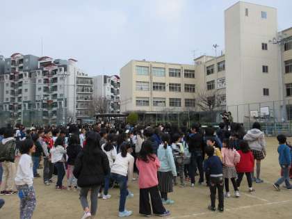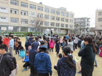 全校児童が運動場に集まり、集会委員の司会で『6年生についての〇×クイズ』を行いました。