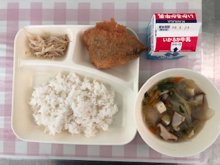 18日の給食は、いわしのフライ・五目汁・もやしのしょうがじょうゆかけ・ごはん・牛乳です。