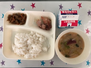 19日の給食は、鶏肉の照り焼き・さつまいものみそ汁・きんぴらごぼう・ごはん・牛乳です。