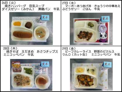 今週は、2学期が始まって間もないため、ハンバーグや焼きそば、カレーライスなど、食べやすく、子どもたちに人気の献立が多かったです。ゼリーや缶詰の果物の日も多く、子どもたちは毎日ほとんど残さず食べることができていました。