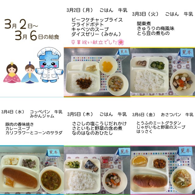 2日の卒業祝い献立は、いつもの給食より1品おかずが増えて、子どもたちも嬉しそうな様子がうかがえました。