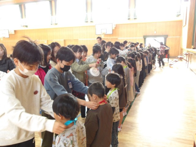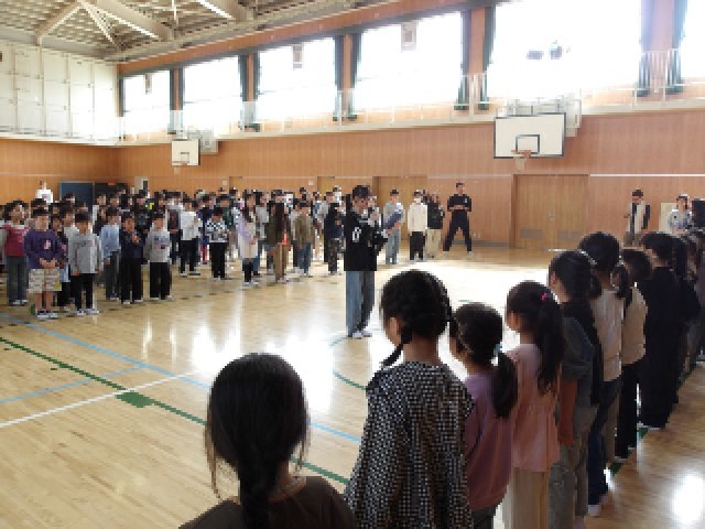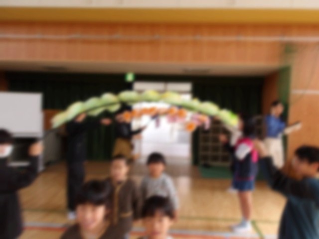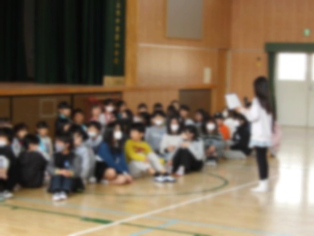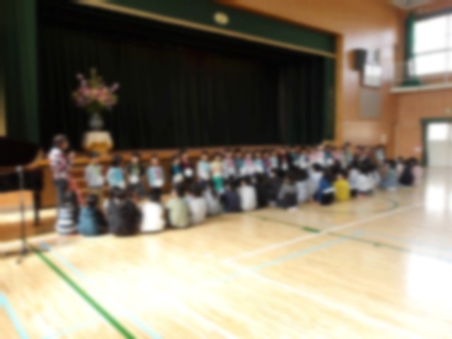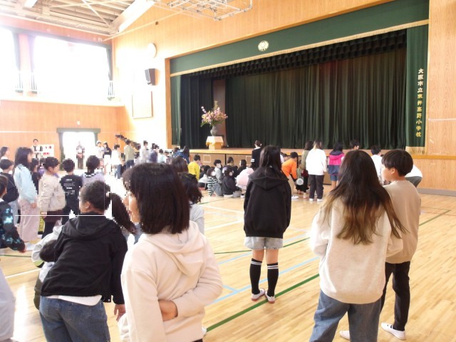 今日、新入生を迎える会を行いました。本年度初めて行動に全学年がそろいました。一年生は拍手の中迎えられ、歓迎の歌とダンスのプレゼント、そして歓迎のメダルをもらいました。そのあと、〇✕クイズをし、みんなで校歌をうたいました。1年生のみんなも校歌を覚えたら、早くみんなでいっしょに歌えるといいなと思います。