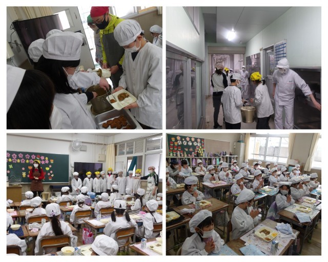 桜の花びらの形をしたラッキーにんじんも入っていて、小学校の給食を始めて食べる1年生は、ワクワクしながら食べる様子がうかがえました。