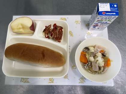 今日の献立は、とうふローフ、カリフラワーのスープ煮、りんご、黒糖パン、牛乳です。