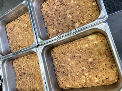とうふローフは、ツナ、とうふ、細かくカットした大豆、たまねぎ、でん粉を混ぜ合わせ、砂糖、塩、こいくちしょうゆで味付けし、焼き物機で焼いています。給食のとうふローフには卵が入っていないため、卵アレルギーのある人も食べることができます。 -