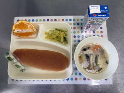 今日の献立は、鶏肉とほうれんそうのシチュー、キャベツのサラダ、デコポン、コッペパン、マーガリン、牛乳です。
