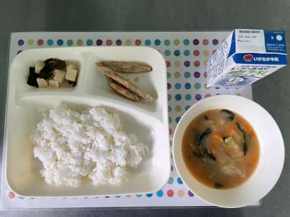 今日の献立は、きびなごてんぷら・みそ汁・わかたけ煮・ごはん・牛乳です。