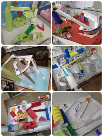 4年生で図画工作科の時間に作ったコロコロガーレ。スタートからゴールまでのコースを自分で考えて作りました。