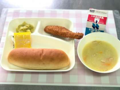 今日の給食は、サーモンフライ・豆乳スープ・キャベツのカレーソテー・大型コッペパン・アプリコットジャム・牛乳です。