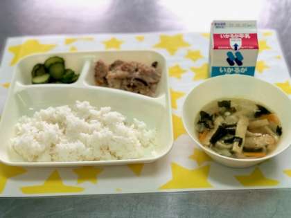 今日の給食は、ぶたにくのごまだれやき・ごもくじる・きゅうりのおかかあえ・ごはん・牛乳です。