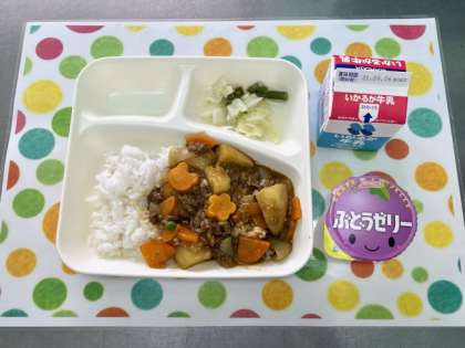 今日の給食は、ビーフカレーライス【こめこ】・やさいのピクルス・ぶどうゼリー・ごはん・牛乳です。