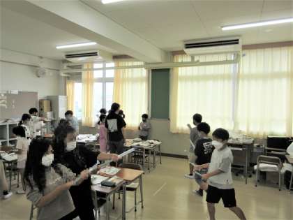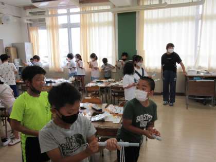 4年生が理科の「とじこめた空気や水」の学習で、空気でっぽうを使った実験をしていました。「どうしたら遠くまで飛ぶか。」「どうしたらまっすぐ飛ぶか。」を実際に確かめていました。