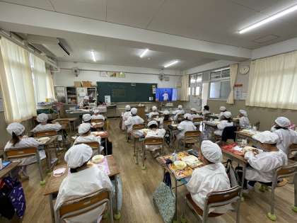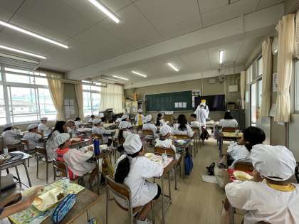 今日の給食は、焼きそば・オクラの甘酢あえ・ぶどう(巨峰)・黒糖1/2パン・牛乳です。