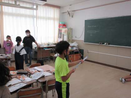 グループで実際に図形を切ったり貼ったりして考えるのですが、折って裏返すと表も裏も同じ長方形になることに気づいたグループもあり、子どもたちの柔軟な発想には驚かされました。