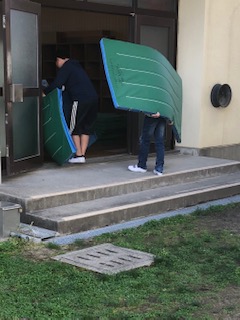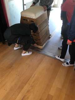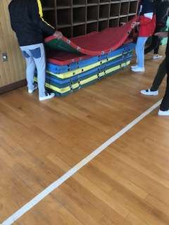 卒業式、入学式の間、別の場所にしまっておいたとび箱やマットなどの物品を講堂に戻しました。6年生が協力して行いました。