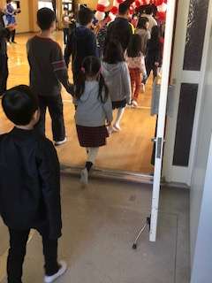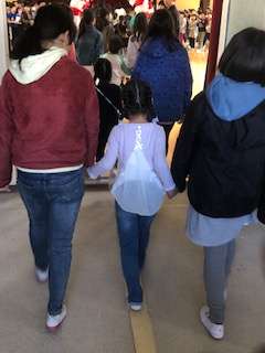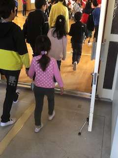 1年生の入場です。6年生のお兄さん、お姉さんが手をつないで講堂に入っていきます。