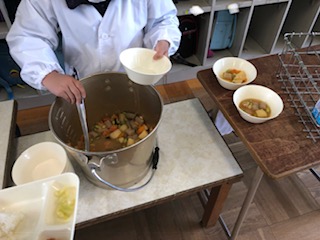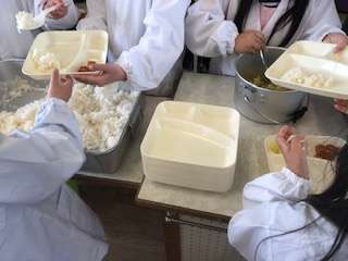 入学して1週間がたちました。1年生は給食当番がおかずやごはんを盛り付けることにもチャレンジしています。