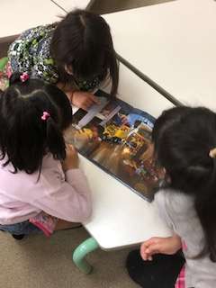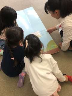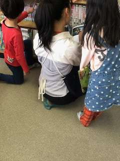 1年生も学校の図書館を利用します。大きな絵本が人気です。