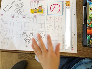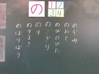 今日は、「の」を学習しました。習ったひらがなが後ろの黒板に貼ってあります。