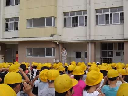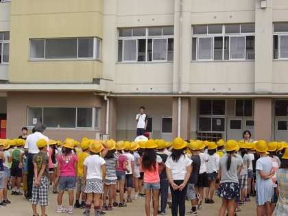本日の朝、児童朝会がありました。本日から19日(金)まで教育実習生が2名来ます。5年生の児童を中心に一緒に勉強します。今日の朝会はその教育実習生の紹介と、本日から一週間始まる「あいさつ運動」のお話がありました。