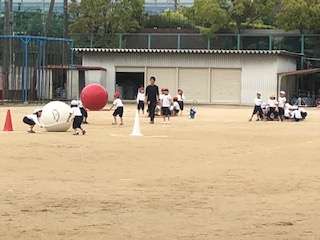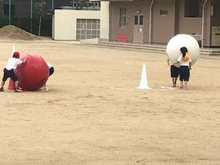 運動会の練習で大玉と格闘しています。