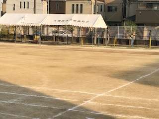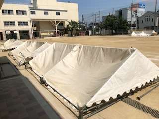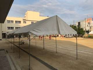 運動場にテントを張りました。運動会の練習の時の休憩などに活用していきます。