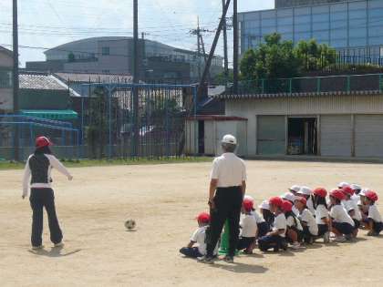 キックベースボールにつながるゲーム「ドンピーゲーム」をしています。