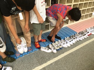 全学年で眼科健診を行いました。脱いだ靴をそろえてから保健室に入っていきます。