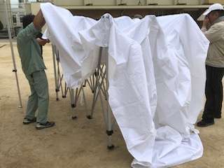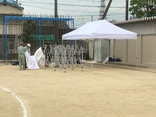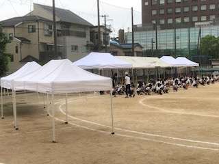 今年購入したテントを設営しています。児童席すべてを覆うことができます。日差しや雨などから子どもたちを守ることが期待されます。