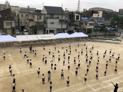 運動場いっぱいを使って子どもたちが踊っています。いよいよ明後日が運動会となります。