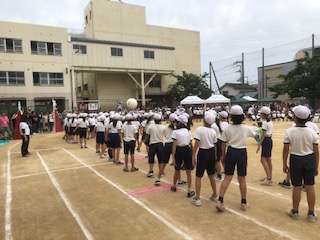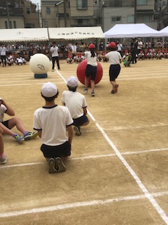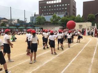 全校競技の大玉おくりを1年生から6年生が協力しながら進めています。