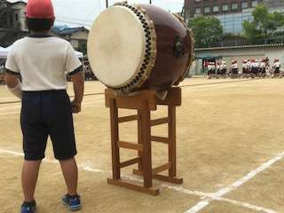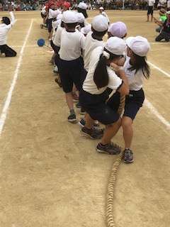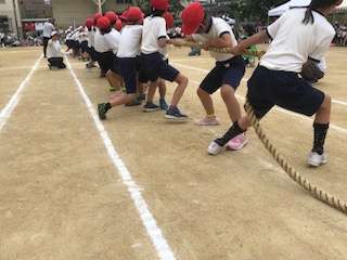 運動会の団体競技の最後は4年生のつな引きです。声をかけあって一生懸命引っ張っています。太鼓で合図を送ります。