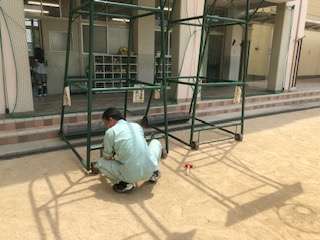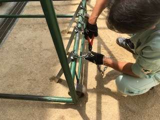運動会が終わり、元の場所に用具などを戻していきます。バスケットゴールも戻して杭で固定しました。