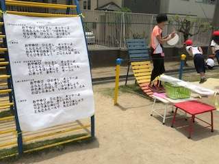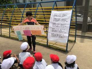 歌に合わせて鉄棒をしています。説明もしっかりと聞いています。