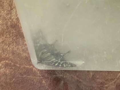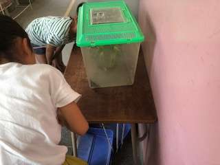 飼育しているアゲハチョウが羽化して成虫になりました。子どもたちがケースをのぞき込んでいます。