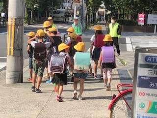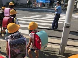 登校時間には、警察官や地域の見守りの方々が子どもたちを見ておられます。