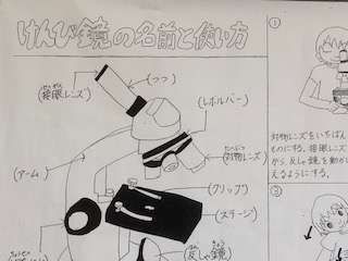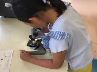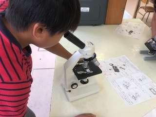 けんび鏡を学習しました。一人一人レンズをのぞいています。