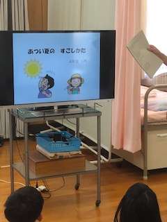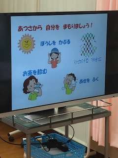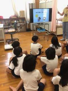 養護教諭が体重測定の前に保健指導を行いました。今日は、暑さから身を守ることについて学びました。