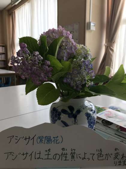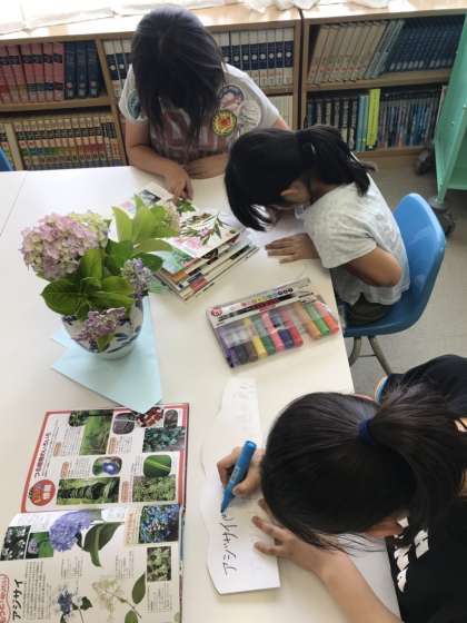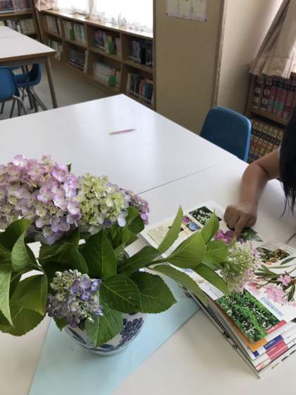 地域の方からアジサイをいただきました。(ミズキ目 アジサイ科)図書館に飾っています。図書委員会の児童がアジサイについて調べています。