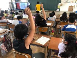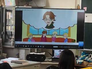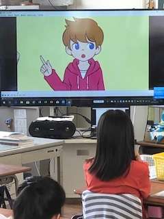 1時間目の前に行なっている英語タイムでは画面での英語の会話を聞き取って答えています。